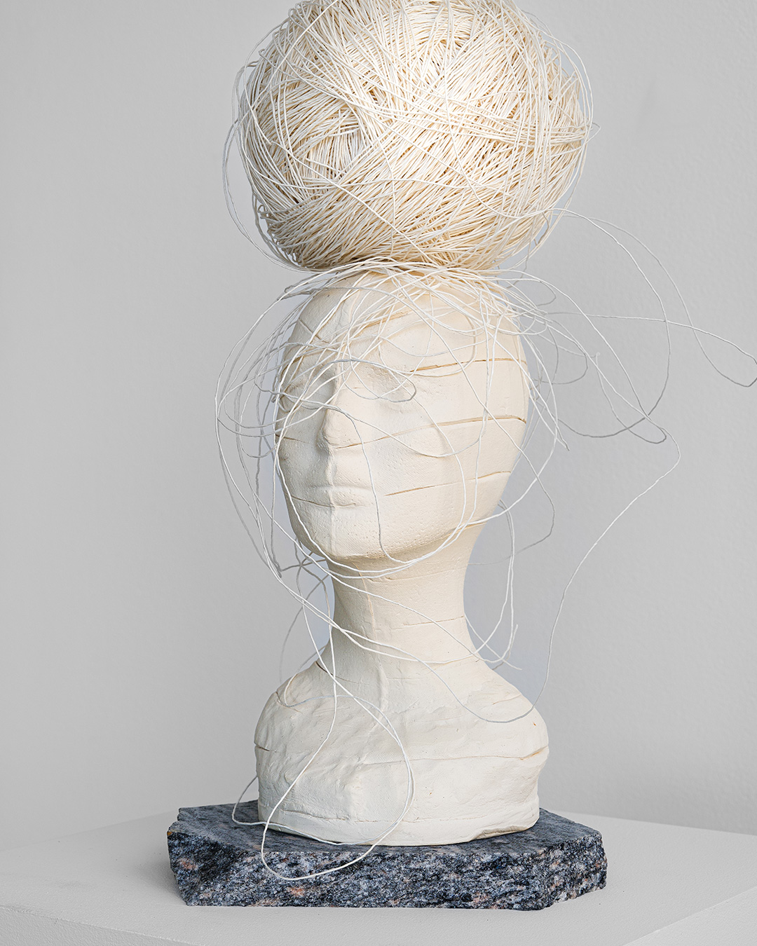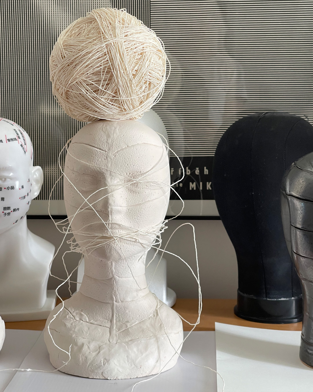 Blending industrial processes with hand building, the molds for the mannequin heads in What We Carry were first made at Pewabic. They were then layered with strips of clay through an intense, hand process that intentionally preserves the seams and surface markings of the molds. Each head remains unglazed, revealing the raw character of the clay and the traces of its making.